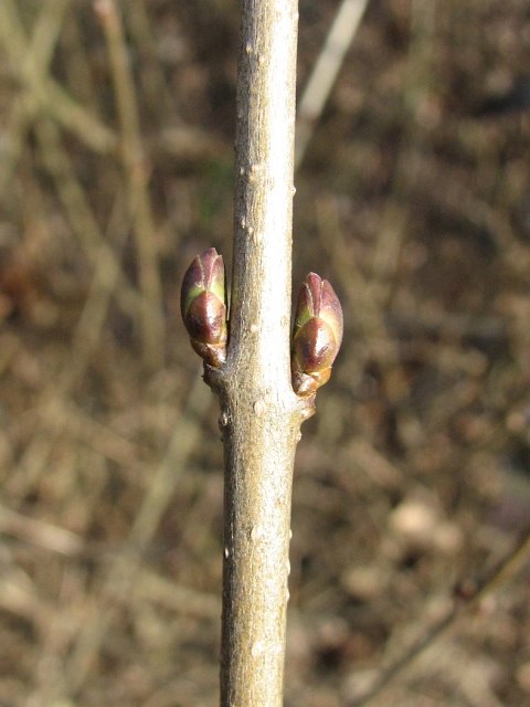 Jajowate pąki posiadają brązowopurpurowo zabarwione łuski i luźno przylegają do pędu. |