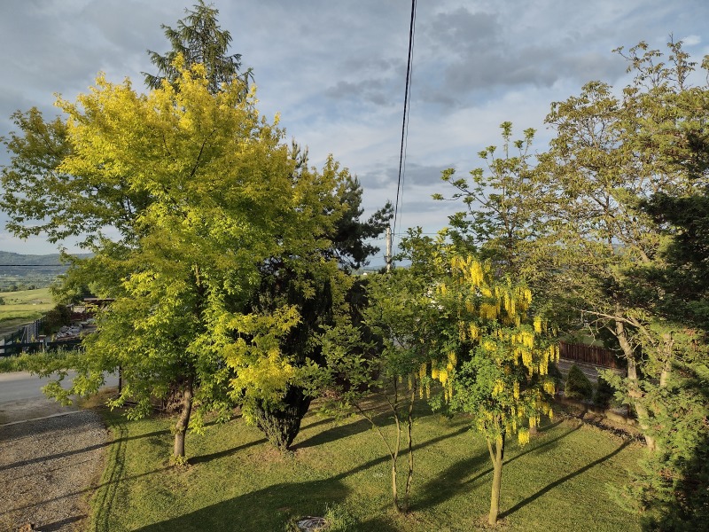 | Z drugiej strony domu żółtymi barwami zachwycają klon jesionolistny 'Odessanum' i kwitnący złotokap Waterera 'Vossi'. |