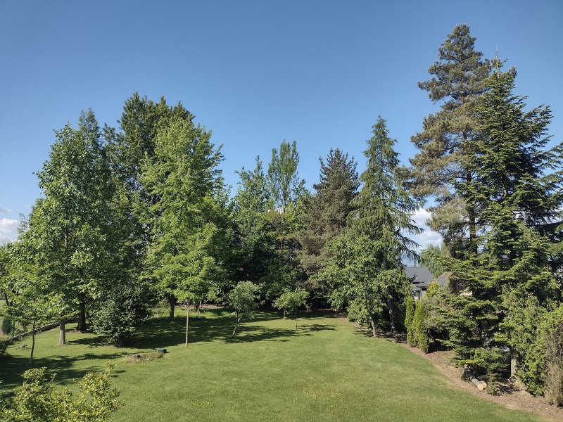 2025-06-15. W ubiegłym roku musieliśmy wyciąć pięknego soliterowego jesiona gdyż załaniał instalację fotovoltaiczną. Poza tym przez ostatnie lata nic ciekawego się nie działo. Topola balsamiczna umacnia swoje prowadzenie; wczorajszy pomiar wysokości wskazał 26.4 m, a mierzomy we wrześniu 2024 r. obwód wyniósł 2.06 m. Topola kanadykska we wrześniu 2024 r. mierzyła 21.4 m, i miała pień o obwodzie 1.02 m. W tym roku usechł jej jednak półmetrowy kawałek najwyższego wierzhołka (na zdjęciu z maja jeszcze tego nie widać).